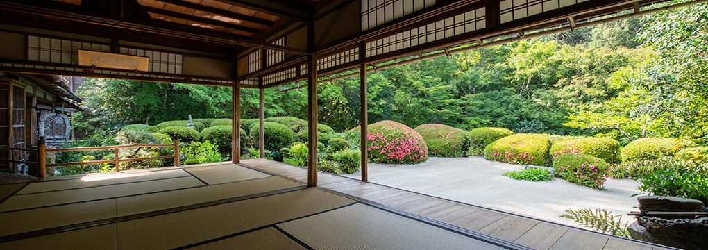 キリシマツツジが彩りを添え、5月下旬には白砂に映えるサツキが見頃を迎えます。初夏の青もみじとサツキの緑が織りなす清々しい風景は、詩仙堂を代表する景観の一つです。アヤメも美しく咲き誇ります。